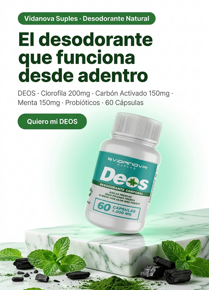 DEOS es el primer desodorante corporal en cápsulas de Chile. Actúa neutralizando el mal olor desde su origen bacteriano, sin tapar los poros ni alterar tu transpiración natural. Clorofila, Carbón Activado, Menta, Probióticos y plantas depurativas trabajan juntos para que tu cuerpo huela bien de verdad, desde adentro. 60 cápsulas de 1.000mg por frasco.