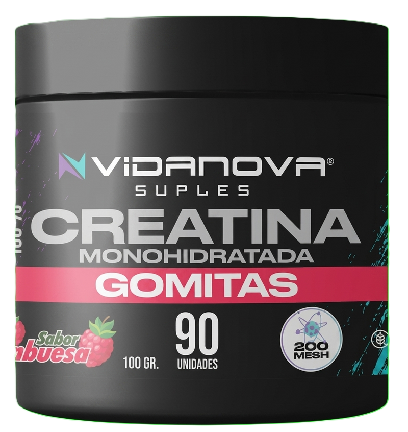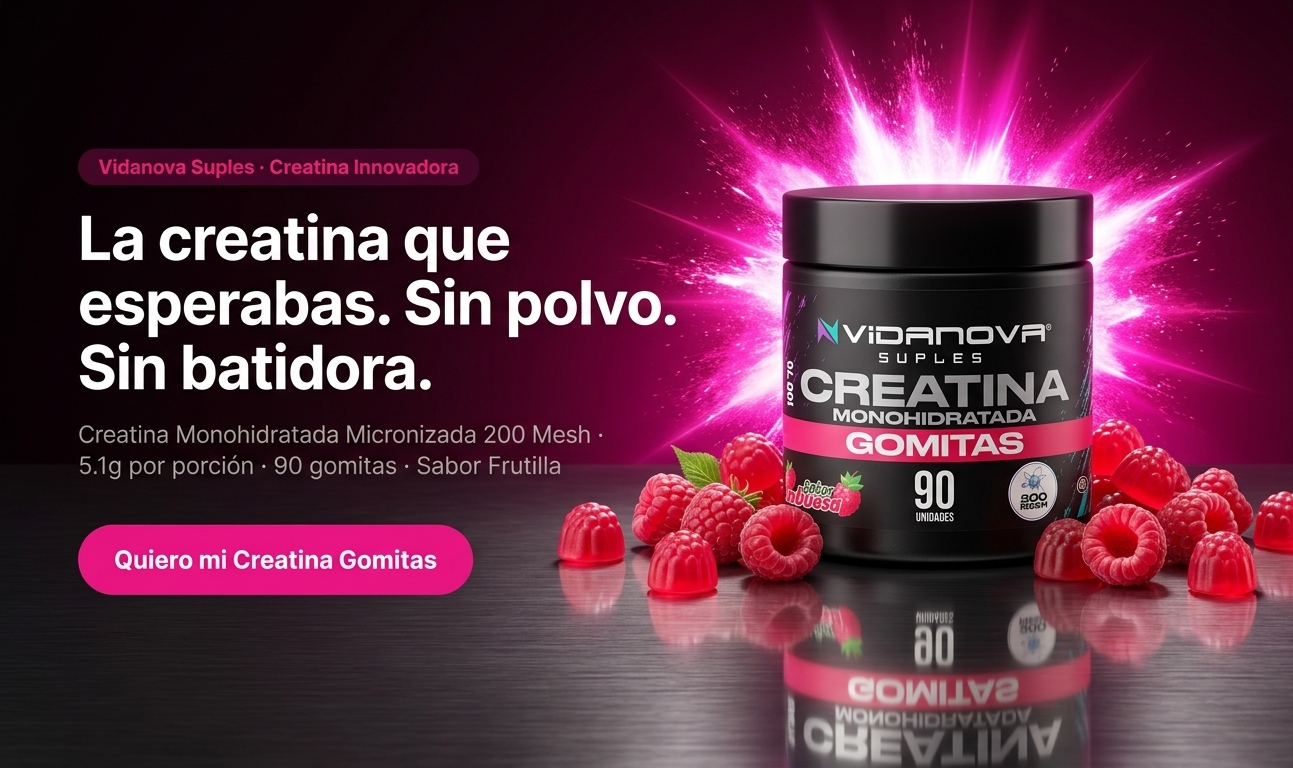 Creatina Monohidratada Gomitas es la revolución en el formato de la creatina más estudiada de la historia. Misma Creatina Monohidratada Micronizada 200 Mesh con 5.1g de pureza absoluta por porción, ahora en formato gomita sabor frutilla que puedes tomar en cualquier momento y lugar sin polvo, sin batidora y sin excusas. 90 gomitas · 30 porciones por frasco.