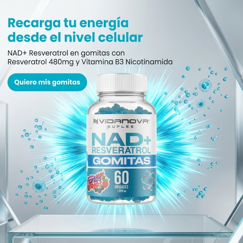 NAD+ Resveratrol es el suplemento de nueva generación que reactiva la producción de energía celular, frena el envejecimiento desde adentro y te devuelve la vitalidad que creías perdida. 60 gomitas de 1.000mg sabor frutos rojos.