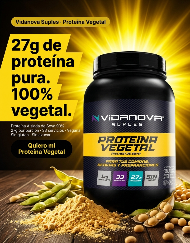Proteína Vegetal Aislada de Soya es la proteína de origen vegetal más completa y versátil del mercado. Con 27g de proteína de alta calidad por porción, 90% de pureza aislada y perfil de aminoácidos completo, apoya el desarrollo y mantenimiento muscular, controla el colesterol y contribuye a la salud ósea y hormonal. Vegana, no GMO, sin gluten y sin azúcar. Para tus batidos, comidas y preparaciones. 1kg · 33 servicios.